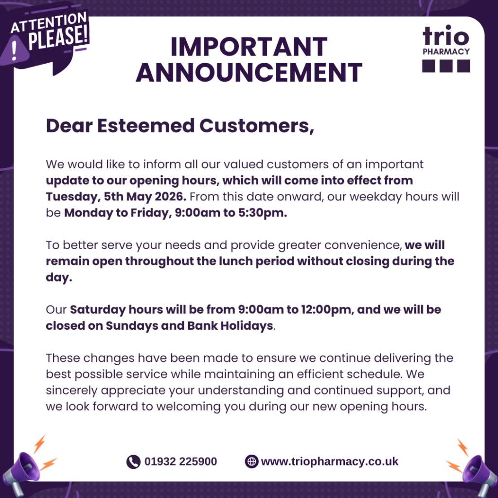 Your trusted healthcare partner in Shepperton. As the only independent pharmacy in Shepperton, we’ve been dedicated to serving our community for over forty years with exceptional care. At Trio Pharmacy, we offer a wide range of clinical services, including our Travel & Vaccination Clinic, Ear Wax Removal Clinic, Weight Loss Clinic, Diabetes Clinic, Skin & Hair Clinic and Mobility Centre. Our commitment to providing professional, evidence-based advice and personalized care sets us apart. We’re here to empower you with the health information and support you need, always delivered with a compassionate touch.